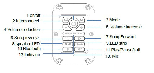 I/O DESCRIPTION 1. Battery Power input: Input 12V / 10A 2. USB Port: Insert USB to play music, insert USB charging cable can charge mobile phones and other mobile devices output 5V=1A 3. AUX IN : 3.5mm audio cable audio source input